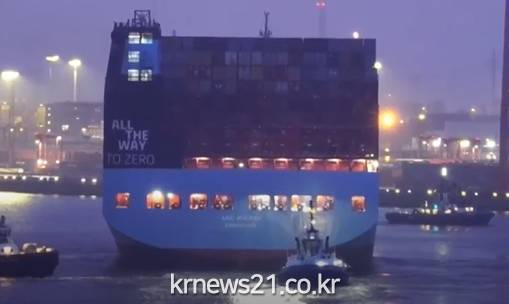 ▲ 사진=KBS NEWS 영상 캡처길이 351m, 너비 54m, 높이 33m에 이르는 만 6천 TEU급 초대형 컨테이너선 '아네 머스크'호가 함부르크 항에 모습을 드러냈다.