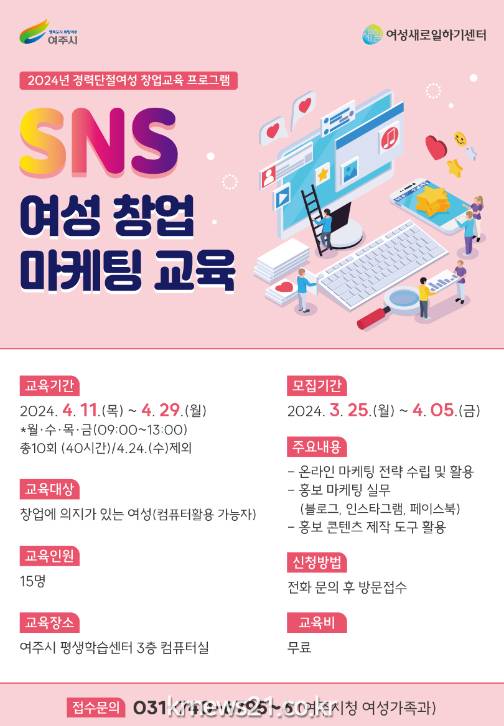 ▲ 사진=여주시여주시는 2024년 SNS 여성 창업 마케팅 교육을 4월 11일부터 4월 29일까지 10회에 걸쳐 무료로 진행한다.