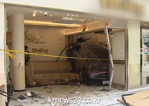 30미터가량 질주하던 차량은 속도를 이기지 못해 유리창을 뚫고 들어가, 카페 안쪽 벽을 들이받고서야 멈춰 섰다.