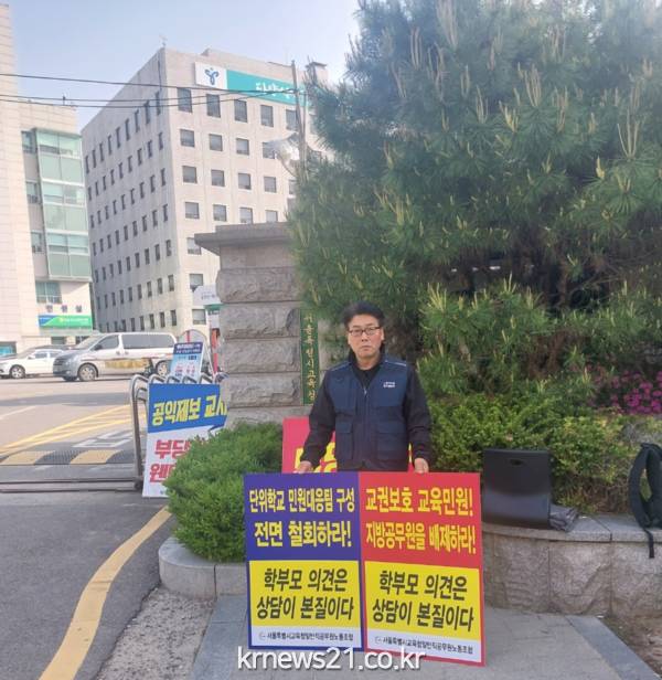 서울시 교육청 공무원노조(이하 서울 교육노조)와 서울시 일반직 교육청 공무원노조(이하 서일노)는 교권보호을 위해 서울시교육청(교육감 조희연)에 일방적으로 교사의 학부모상담업무를 행정실로 전가 시키려는 형태를 단호히 거부하며 조합원 1인 릴레이 시위에 들어 간다고 20일 밝혔다.