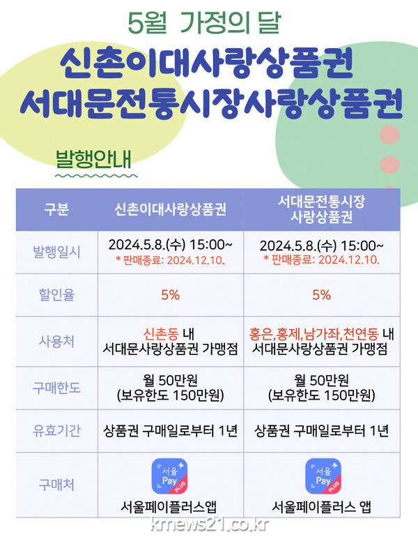 서대문구가 자체 발행하는 ‘신촌이대사랑상품권’과 ‘서대문전통시장사랑상품권’이 5월 8일 오후 3시부터 ‘서울페이플러스’ 앱을 통해 5% 할인된 가격으로 온라인 판매된다.