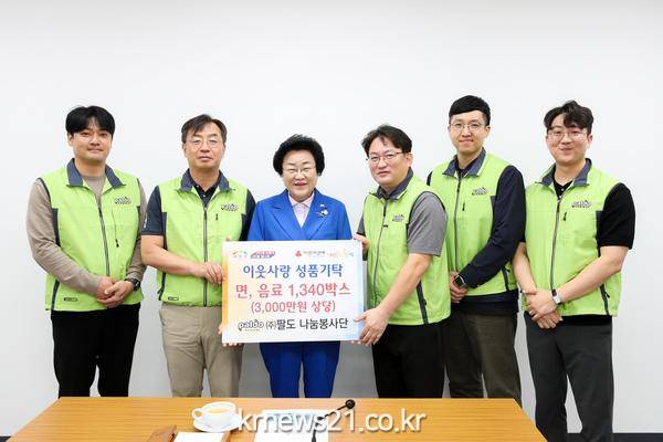 이번 성품은 봉사단 소속 팔도 직원들이 매 월급의 일정 금액을 모아 마련되었다. 5월 가정의 달을 맞이하여 이천시 지역아동센터 소속 아동에게 팔도 인기 제품 꾸러미 320개 (1,000만 원 상당), 기초생활수급자 독거노인 및 등록장애인에게 ‘왕뚜껑’,‘설렁탕면’ 1,100박스(2,000만 원 상당)을 전달했다.