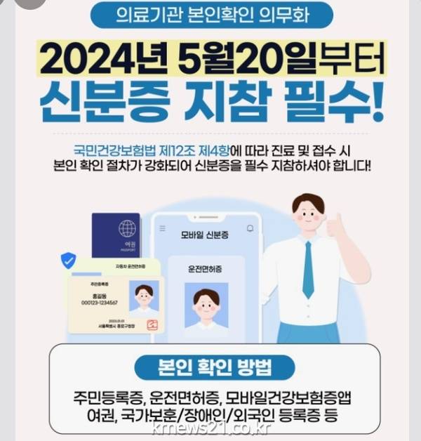 주민등록증이나 운전면허증처럼 사진과 주민등록번호가 나와 있는 증명서를 제시해야 하며, 신분증이 없으면 건강보험을 적용받을 수 없다.