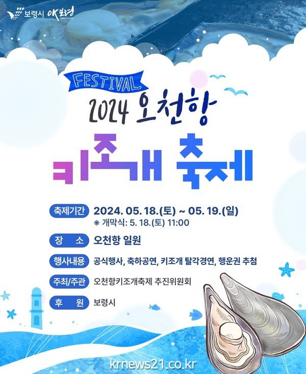 행사 기간에는 오천항의 아름다운 해안을 배경으로 키조개 탈각경연, 행운권 추첨 등이 진행돼 가족, 연인, 친구들과 함께 소중한 경험을 만들 수 있다.