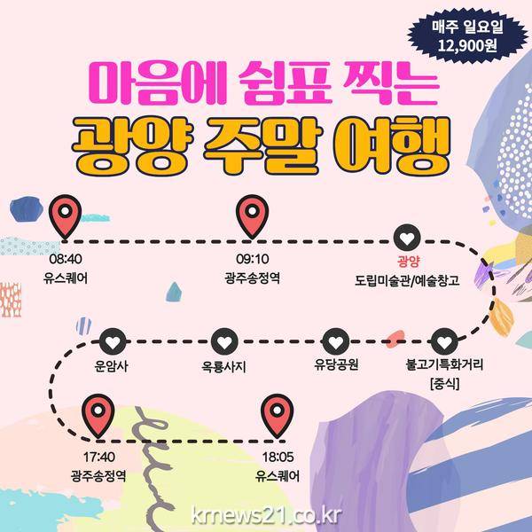 이어 서천변 광양불고기특화거리에서 점심을 즐긴 후 유당공원, 옥룡사지, 운암사 등에서 고요하고 편안한 주말 오후를 즐기고 유스퀘어(18시 5분)에 도착하는 코스이다.