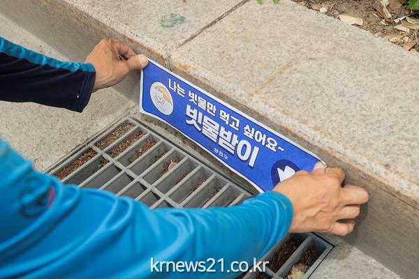 크기를 확대하고, 어두운 보도블록과 대비될 수 있도록 밝은 색감의 디자인을 적용해 시인성을 강화했다. 아울러 빗물받이 주변 쓰레기 무단투기를 예방하기 위한 홍보문구를 삽입해 기능성을 가미했다.