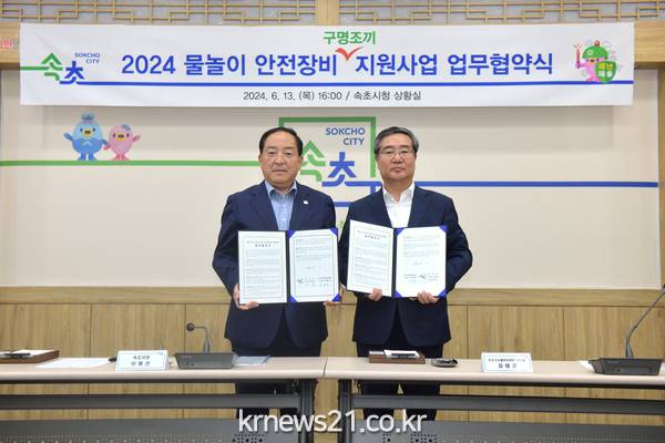 속초시는 여름철 물놀이 사고예방을 위하여 속초시시설관리공단과 물놀이 안전장비(구명조끼) 지원사업 업무협약을 13일 체결했다.