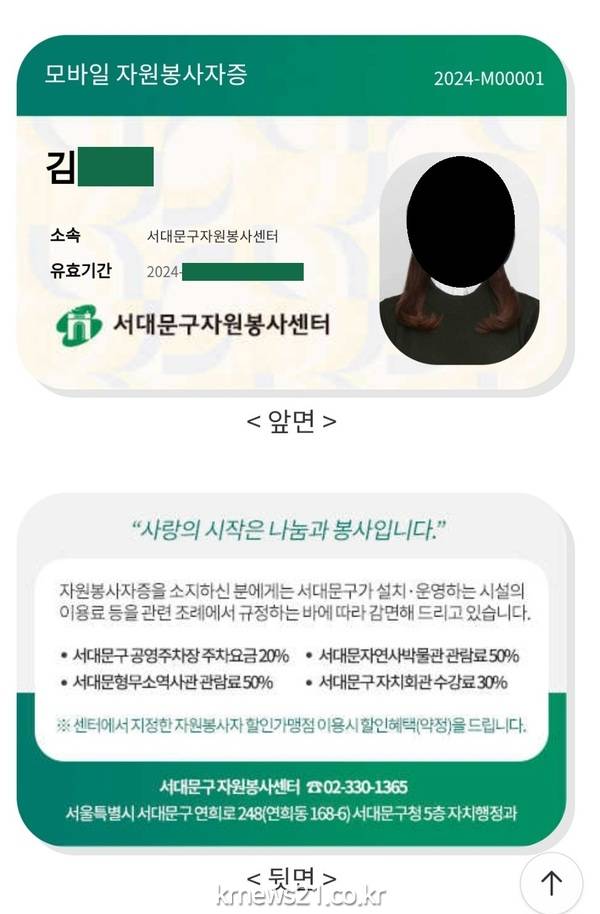 구는 모바일 및 전자기기 이용이 어려운 구민을 위해 기존 ‘실물 카드형 자원봉사자증’도 서대문구자원봉사센터(서대문구청 5층 자치행정과)에서 계속 발급한다.