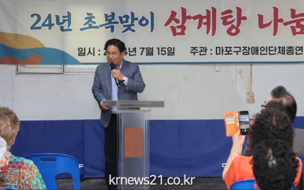 박강수 마포구청장은 15일 오전, 성산SH아파트 장애인단체 강당에서 열린 ‘2024년 초복맞이 삼계탕 나눔 행사’에 참석했다.