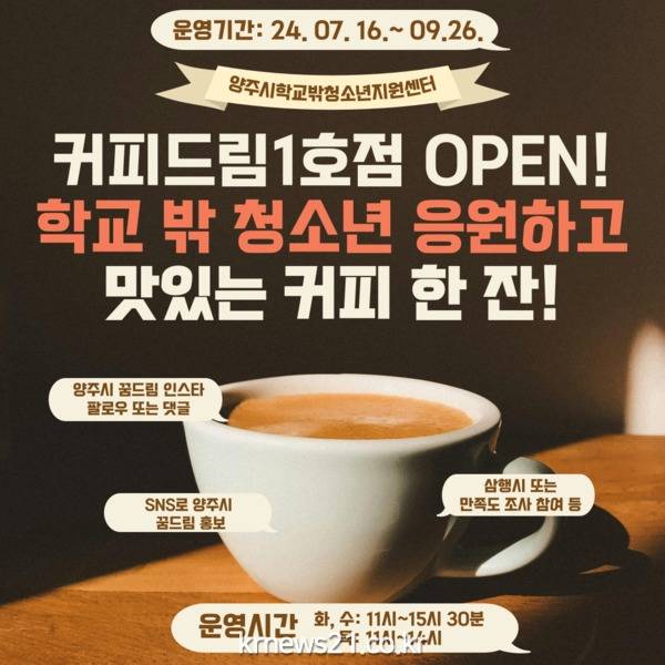 양주시학교밖청소년지원센터에서는 오는 16일부터 9월 26일까지 양주 청소년문화의집(고읍동 소재) 2층 자립작업장 맛나만나에서 학교 밖 청소년이 직접 운영하는 ‘커피드림 1호점’을 운영한다고 밝혔다.