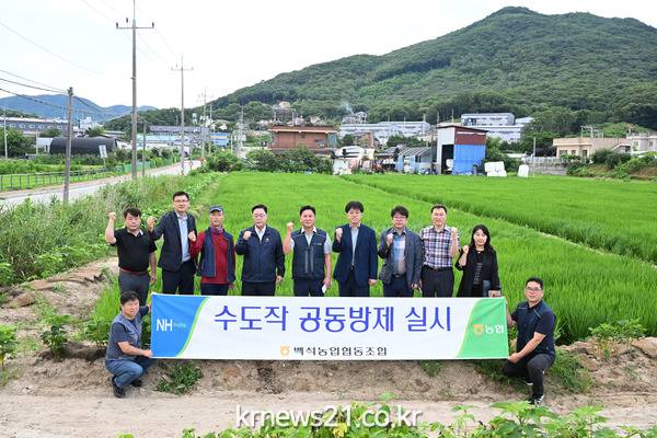 이날 강수현 양주시장은 김화은 농업기술센터 소장 및 관계 간부 공무원, 이용재 백석농업협동조합 조합장 및 조합원 등과 함께 관내 백석읍 소재 총 795ha의 면적의 농지(벼, 콩)를 대상으로 한 드론 활용 공동방제 현장을 둘러보며 직접 시연에 나섰다,
