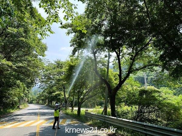 장성군이 주요 도로변의 가로수 3만여 그루에 대한 지속적인 예찰 활동과 적기 방제를 추진 중이다.