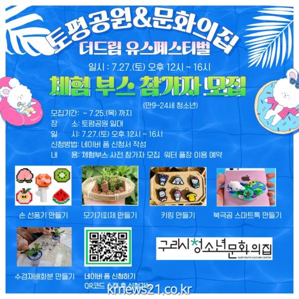 구리시청소년재단(대표이사 강종일) 청소년문화의집은 오는 7월 27일(토) 12시부터 16시까지 토평공원 일대에서 개최되는 ‘더드림 유스페스티벌’에 참여할 청소년을 7월 25일까지 모집한다.