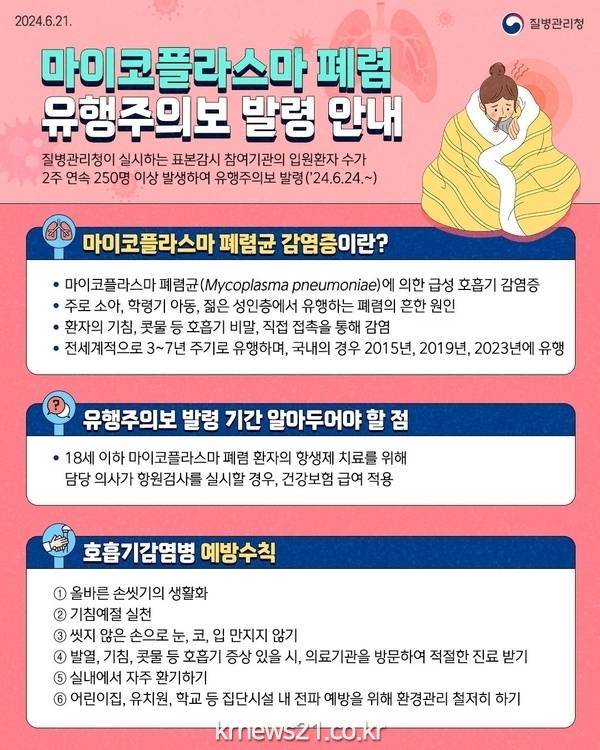 군에 따르면, 마이코플라스마 폐렴균 감염은 최근 4주 동안 전국적으로 1.7배 증가했다. 이전까지는 3~4년에 한 번씩 유행하다가 지난 겨울에 이어 올해 다시 유행하는 등 주기가 짧아졌다.