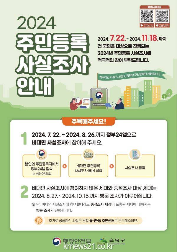 은평구(구청장 김미경)는 오는 11월 18일까지 ‘2024년 주민등록 사실조사’를 실시한다고 밝혔다.