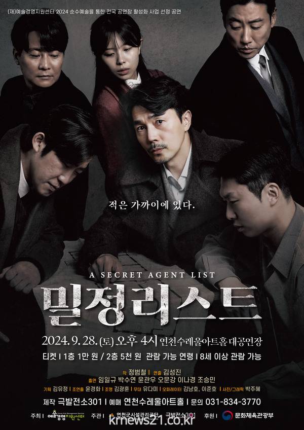 연천수레울아트홀은 오는 9월 28일 오후 4시 창작 연극 ‘밀정 리스트’를 선보인다. 이번 연극은 2019년 다큐멘터리 KBS 탐사보도부에 방영된 내용을 바탕으로 여전히 많은 밀정들이 독립운동가로 둔갑해 현충원에 안치되어 있다는 역사적 사실을 반영하여 극화한 작품이다.