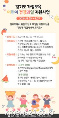 ‘가정보육 어린이 건강과일 지원사업’은 유치원이나 어린이집에 다니지 않고, 가정에서 돌봄을 받는 어린이들에게 신선한 국내산(경기도산 우선) 제철과일을 제공하는 사업이다. 고품질의 신선한 제철과일 섭취를 통해 어린이의 식습관 개선과 건강 증진을 위한 것이다.