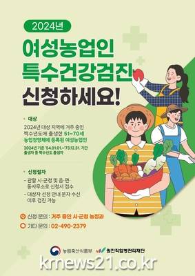 연천군은 여성농업인을 위한 특수 건강검진 대상자를 추가 모집한다고 밝혔다.