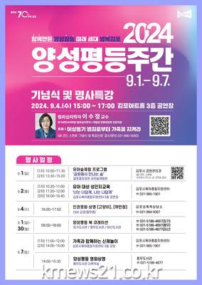 먼저 9월 4일은 김포아트홀에서 양성평등 유공표창과 기념식, 명사특강(범죄심리학자 이수정 교수), 여성사전시, 양성평등 체험부스 등이 진행된다.