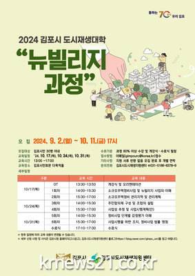김포시(시장 김병수)는 9월 2일부터 10월 11일까지 ‘김포시 도시재생대학 뉴빌리지 과정’ 수강생을 모집한다.