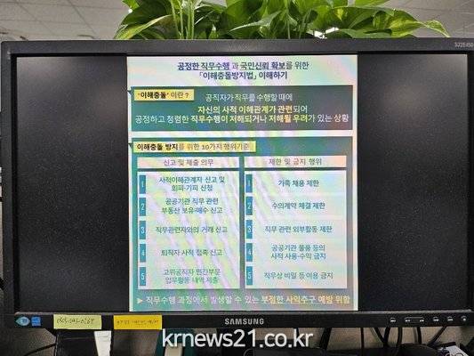 이번 화면보호기는 지난달 8월 부서 자체 청렴교육을 실시하고 이를 실천하기 위한 방안의 일환으로, 일정 시간 컴퓨터를 사용하지 않으면 자동으로 활성화되어 모니터에‘공무원이 알아야 할 공무원 행동강령’의 내용이 나타난다.