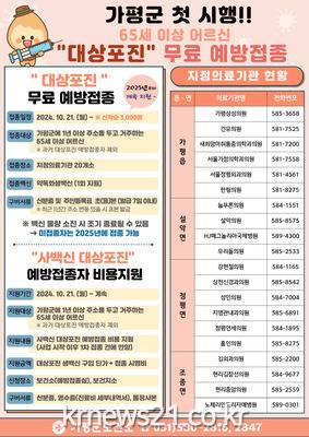 가평군(군수 서태원)이 10월 21일부터 65세 이상 어르신 3,000명을 대상으로 대상포진 무료 예방접종을 실시한다고 25일 밝혔다. 내년부터는 65세 이상 어르신 전체로 확대된다.