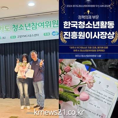 여주시(시장 이충우)는 지난 9월 21일, 여주시 청소년참여위원회 ‘너울’이 2024년 경기도 청소년참여위원회 우수사례 공모전에서 정책 부분 한국청소년활동진흥원 이사장상을 수상했다고 밝혔다.