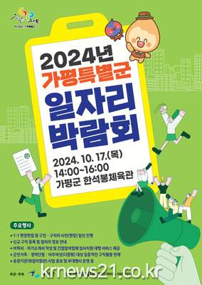 가평군(군수 서태원)은 오는 17일 ‘2024년 가평특별군 대규모 일자리박람회’를 개최한다며 구직 희망자의 많은 참여를 바란다고 밝혔다.