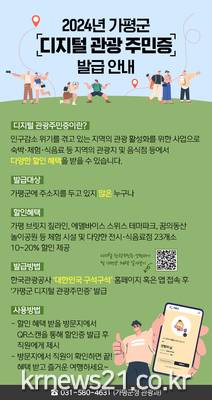 군 관계자는 “가평을 방문하는 관광객들이 더욱 다양한 혜택을 받을 수 있도록 디지털 관광주민증을 적극 홍보하고, 할인 혜택 제공 업체를 지속적으로 늘려나갈 계획”이라고 밝혔다.