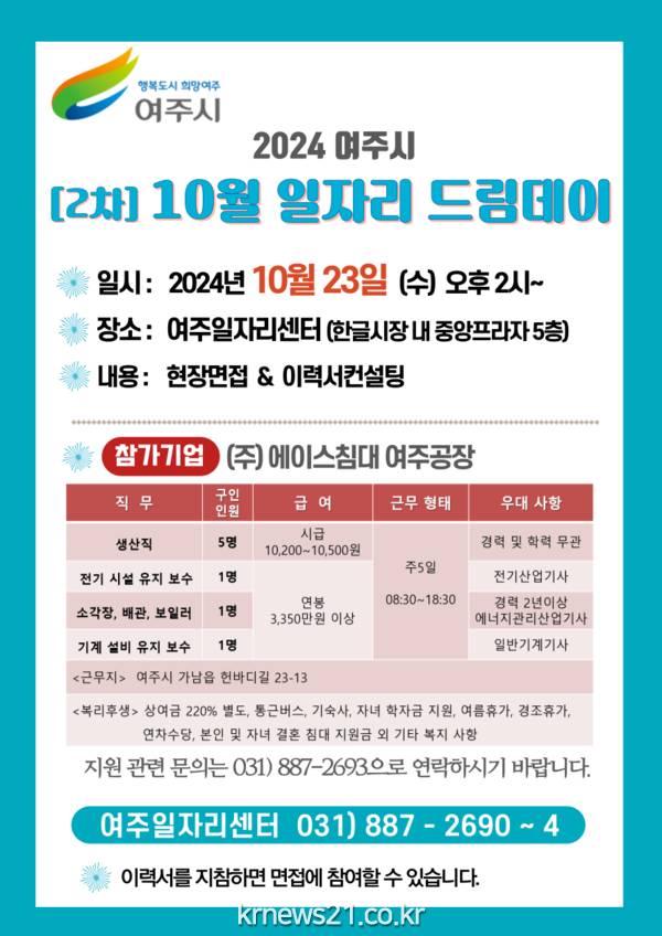 여주시(시장 이충우)는 10월 23일 여주일자리센터에서 2024년 10월 2차 「일자리드림데이」를 실시한다고 밝혔다.