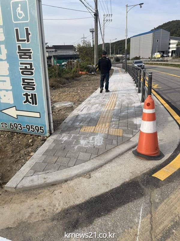 인도를 설치한 곳은 지곡동 361-1번지에서 320-1번지에 이르는 구간으로, 인근에 산업단지와 물류센터가 들어서면서 대형 차량이 자주 드나들어 보행 안전을 위한 대책 마련이 필요했다.