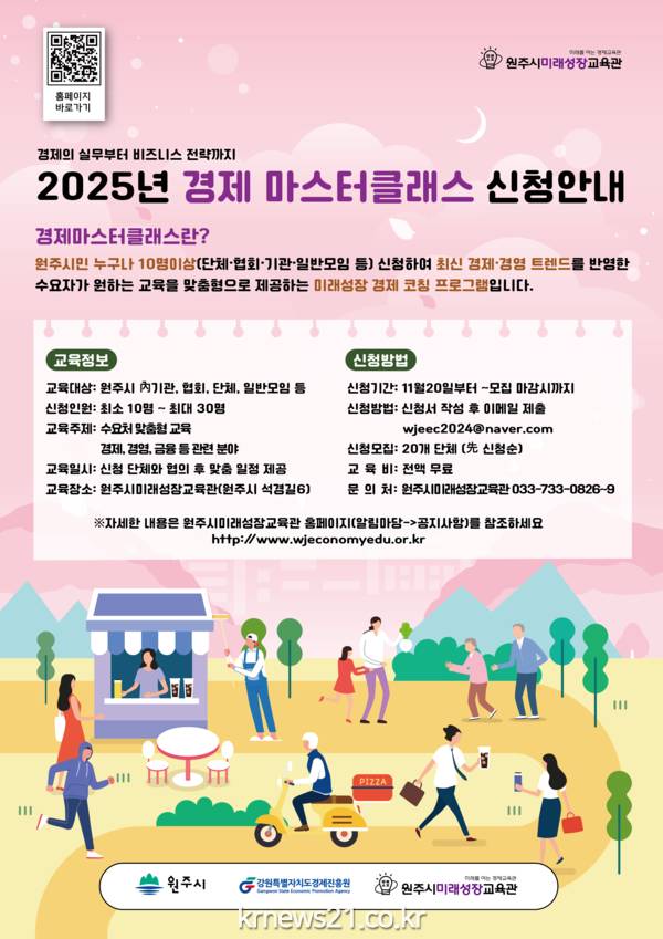 □ 원주시미래성장교육관에서는 시민들의 경제적 성장을 돕기 위해 소통형 경제교육인 ‘2025년 경제마스터클래스’대상자를 모집한다. 이 프로그램은 교육 수요자가 스스로 원하는 경제교육을 신청하고 컨설팅을 통해 맞춤형 강좌를 제공받을 수 있는 방식으로 운영된다.