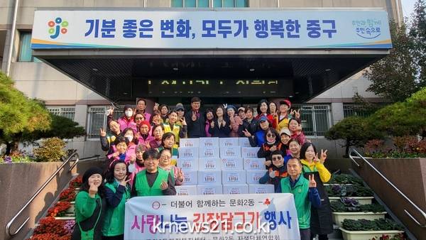 대전 중구 문화2동(동장 임청희)은 21일 문화2동 자생단체와 뉴대전로타리클럽이 연합하여 사랑의 김장나눔 행사를 가졌다고 밝혔다.