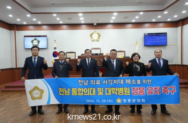 이에 장흥군의회는 정부와 전라남도에 ▲전남도립대 장흥캠퍼스에 의과대학 설립 ▲장흥통합의료병원의 부속병원 지정 ▲2026학년도 개교를 위한 신입생 정원 배정과 지원을 촉구했다.