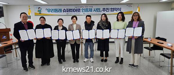 ▲ 사진=부산동래구부산 동래구 사직2동(동장 김현자)은 지난달 29일 지역사회보장협의체(위원 조옥자), 천사후원회(회장 김철규), 말하다 미술(대표 이슬비), 아이비츠 서림(대표 강귀숙), 예인음악학원(대표 김민정), 용인대 태권얍(대표 서보천), 한우리 독서논술(대표 정정희)과「우리동래 슈퍼히어로 인증제 사업」추진을 위한 업무 협약을 체결했다고 밝혔다.