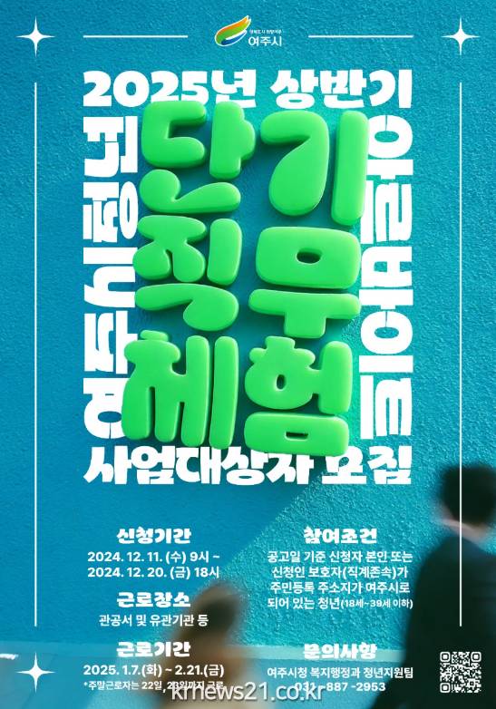 ▲ 사진=여주시여주시는 청년들에게 공공기관에서 직무 경험을 제공하고 경제적 자립을 지원하기 위해 ‘2025년 상반기 청년 단기 직무체험 아르바이트’를 모집한다고 밝혔다.