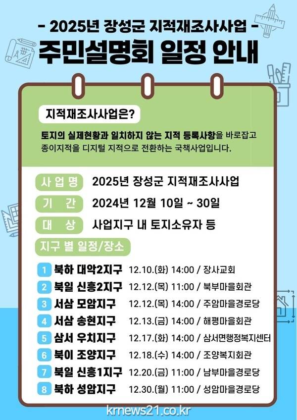 ▲ 사진=장성군장성군이 10일부터 ‘2025년 지적재조사사업 주민설명회’를 시작했다. 마을회관 등을 순회하며 토지소유자‧이해관계인에게 사업추진 배경 및 절차, 기대효과 등을 안내하고 의견을 청취하기 위함이다.