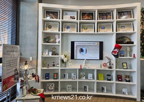 ▲ 사진=여주시여주시 평생교육과 여주도서관은 2024년 12월 10일(스웨덴 현지시간) 한강 작가의 노벨문학상 수상을 축하하며, 그녀의 문학적 성취를 기념하는 특별 도서 전시전 「한강의 책, 세계, 이야기」를 12월 14일부터 시작했다고 밝혔다.