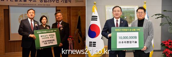 담양군에 따르면, ㈜우리종합기술(대표 김성생)에서 현금 1,000만 원, (유)참푸른글로벌(대표 송석찬)에서 돼지고기 400kg(400만 원 상당), 한전엠씨에스 주식회사(대표 정성진) 및 임직원이 40만 원을 기탁했다.
