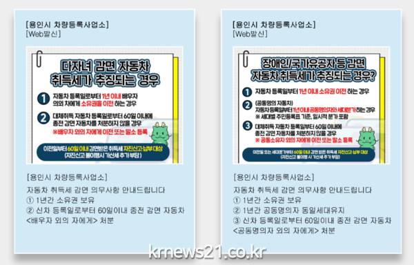 ▲ 사진=용인시용인특례시(시장 이상일)는 자동차 취득세 감면 혜택을 받은 납세자를 대상으로 의무준수사항 안내를 위해 ‘한눈에 볼 수 있는 조아용 문자알림 서비스’를 추가 도입해 운영하고 있다고 19일 밝혔다.
