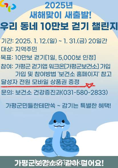 가평군보건소가 새해를 맞아 지역주민의 건강증진을 위해 ‘새해맞이 새출발! 우리 동네 10만보 걷기챌린지’를 개최한다. 이번 챌린지는 1월 12일부터 31일까지 20일간 진행된다.