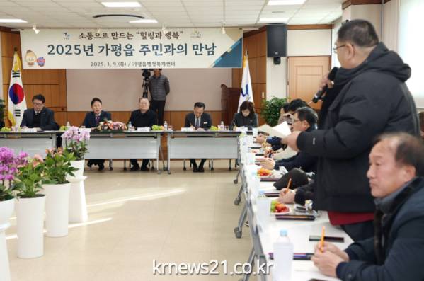 9일 가평읍 행정복지센터에서 열린 ‘2025년 가평읍 주민과의 만남’ 행사에는 지역민을 대표해 마을 이장들과 시민‧사회단체 대표 등 30명이 참여해 지역의 불편사항과 현안을 건의했다. 이를 통해 교통, 복지, 지역상권 등 다양한 분야에서의 요청과 문제점을 공유하며 해결방안을 함께 고민하는 시간을 가졌다.