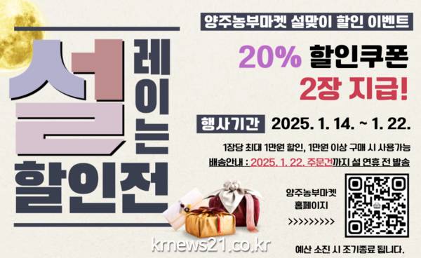 ▲ 사진=양주시양주시(시장 강수현)가 운영하는 농특산물 온라인 쇼핑몰 ‘양주농부마켓’에서 다가오는 설 명절을 맞이해 고객들에게 특별한 혜택을 제공하고자 ‘설맞이 할인 이벤트’를 진행한다고 밝혔다.