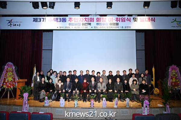 ▲ 사진=구리시청구리시 수택3동주민자치회(회장 이영열)는 1월 8일 구리시행정복지센터 1층 공연장에서 회장 이·취임식과 함께 3기 발대식을 개최했다.