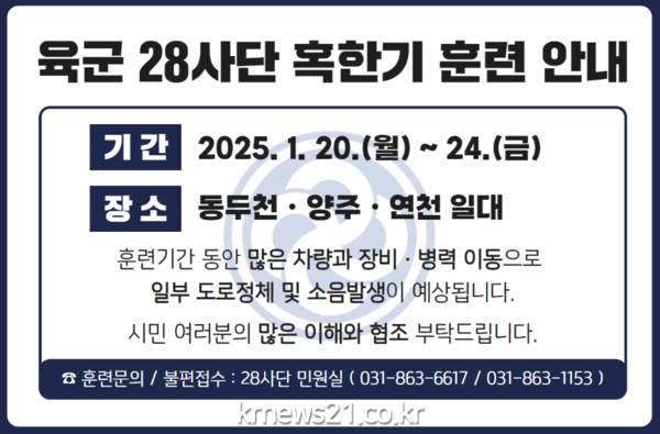 ◦ 훈련 관련 주민 불편사항은 부대 민원실(☎031-863-6617/031-863-1153)로 접수 가능하다.