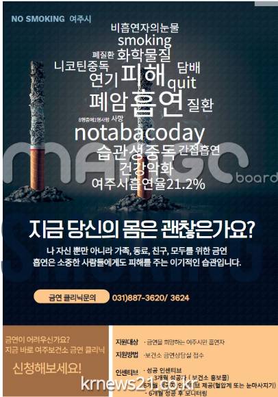 여주시 보건소 건강증진과는 금연클리닉을 통해 지역사회 흡연자의 금연을 지원하고 비흡연자의 간접흡연 폐해 예방을 위한 노력도 기울일 것이라며 적극적인 참여를