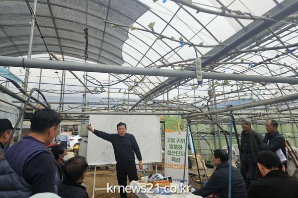 ▲ 사진=고흥군청고흥군(군수 공영민)은 지난 5일 키위연구회 회원의 과원 2곳에서 관내 키위 재배 농업인 30여 명이 참석한 가운데 고품질 키위 재배 기술 교육을 실시했다.