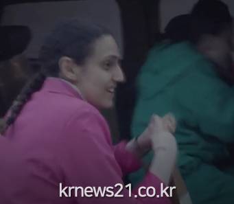 ▲ 사진=KBS NEWS 영상 캡처수천 명의 가자 주민들이 지켜보는 가운데 이스라엘 여성 인질 3명이 적십자 차량에 탑승한다.
