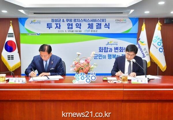 ▲ 사진=장성군장성군이 새해 고용 창출과 경제 활성화의 신호탄을 쐈다. 군은 17일 군청 상황실에서 쿠팡로지스틱스서비스 유한회사(이하 CLS)와 ‘장성 서브허브’ 신설 투자협약을 체결했다. 김한종 장성군수, 홍용준 CLS 대표, 이개호 국회의원 등 관계자 10여 명이 협약식에 참석했다.