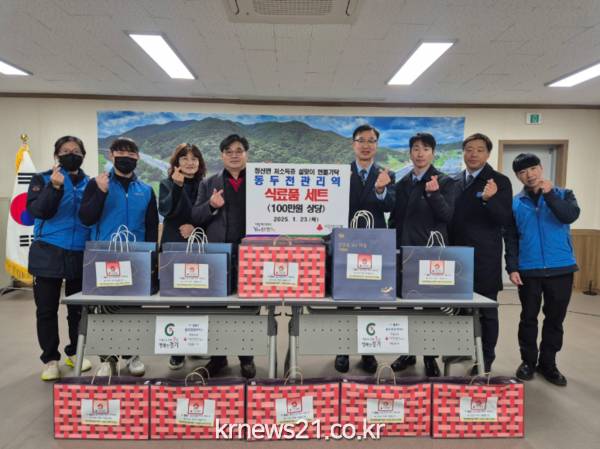 ▲ 사진=연천군청동두천관리역 김사학 역장과 직원들이 23일 연천군 청산면행정복지센터에 방문해 설명절을 앞두고 100만원 상당의 식료품 세트를 기탁했다.